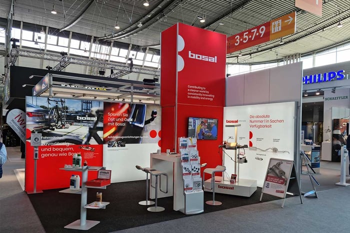 Um das neue Design der Bosal Group in den Fokus zu setzen, wurden mit Hilfe des modularen Rahmensystems die Seitenwände hinterleuchtet. Ein 5 Meter hoher Turm mit integrierter Kabine zieht die Aufmerksamkeit der Messebesucher auf sich. Dieser enthielt einen 55-Zoll-Flatscreen mit 4K-Auflösung für die perfekte Darstellung von Unternehmenspräsentationen.